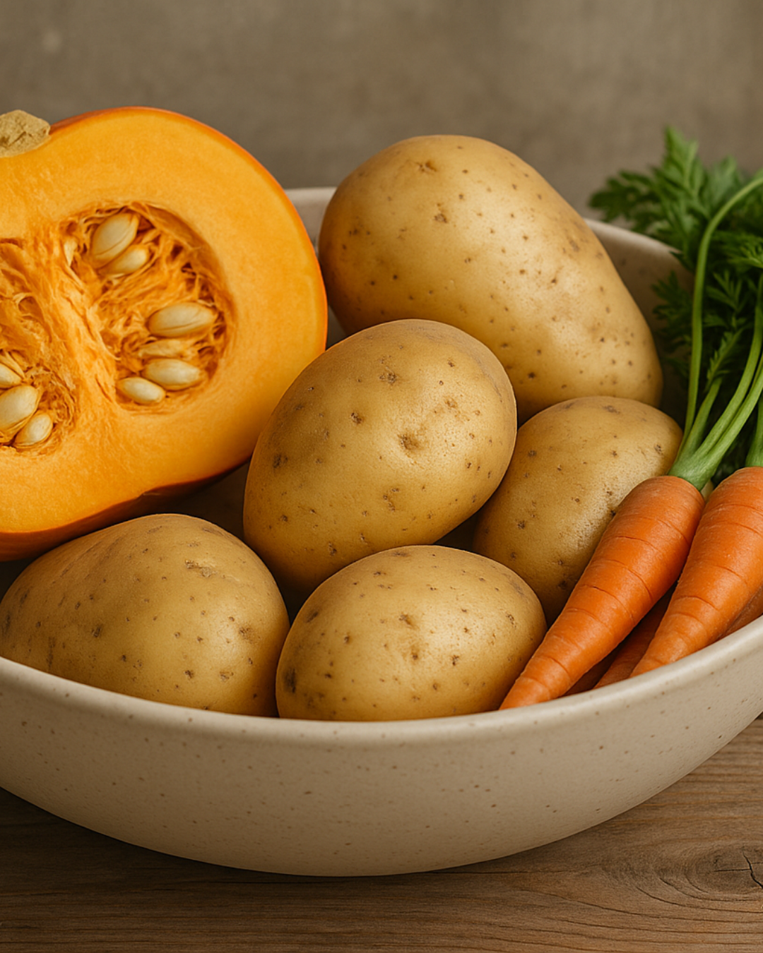 - Aardappelen: licht verteerbaar, rijk aan koolhydraten en vezels, goed voor energie en spijsvertering.